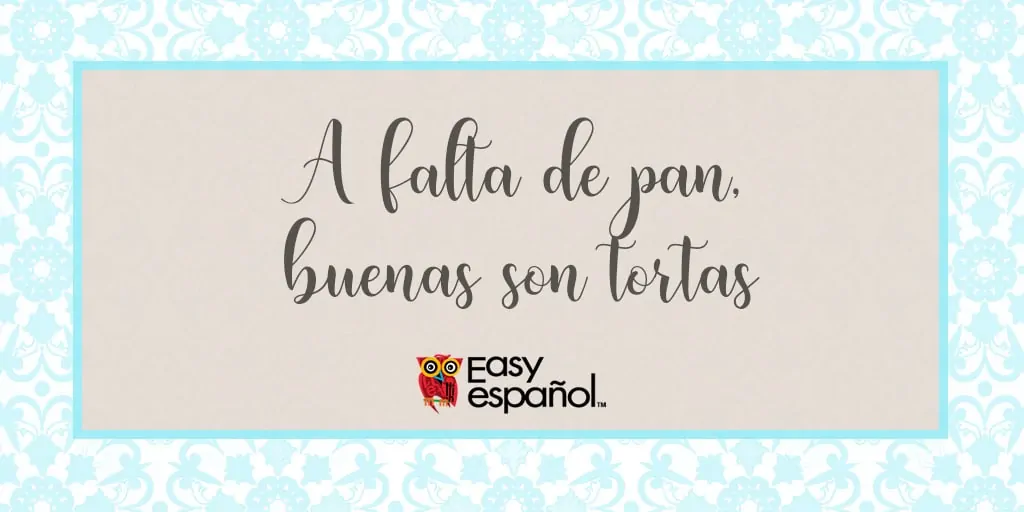 “A falta de pan buenas son tortas” es un dicho popular de origen español que se utiliza cuando alguna persona tiene que conformarse o aceptar algo que sustituye a otra cosa que deseaba mucho más. Podemos decir que este refrán se relaciona con la resignación o el conformismo de lo que llega como segunda opción, por encima de lo que realmente se deseaba.